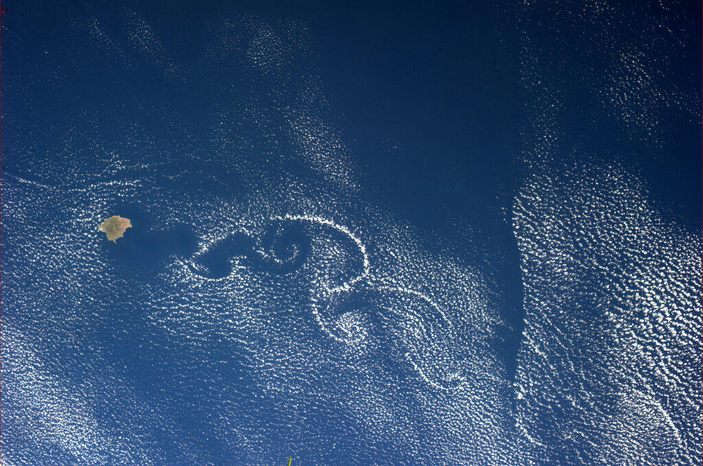 Clouds swirl downwind of Isla Socorro, tracing complex von Kármán vortices. Click to enturbulenate.