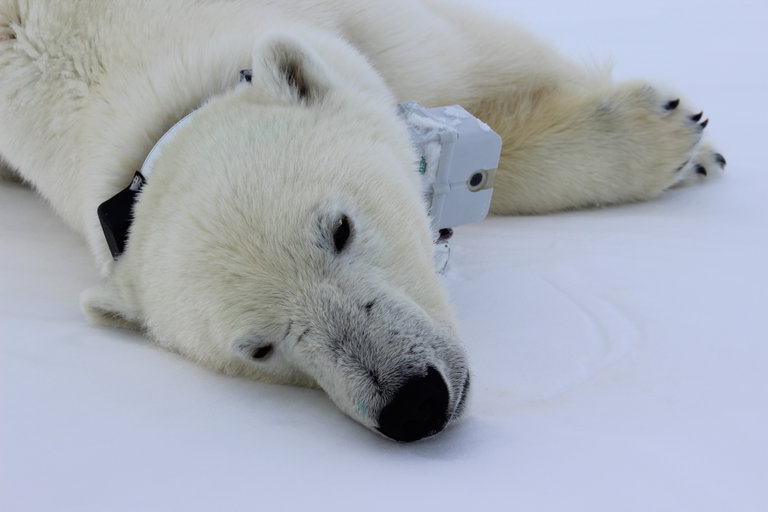 | A polar bear wears a GPS collar equipped with video camera on the sea ice of the Beaufort Sea. | Maria Spriggs, Busch Gardens |