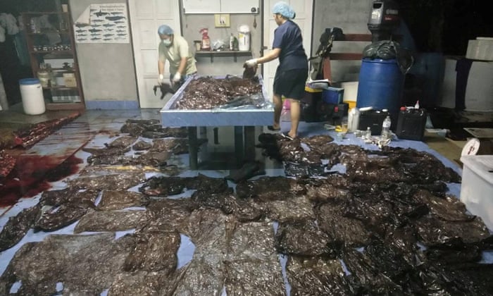 | Some of the plastic bags extracted from a whale’s stomach in Thailand. Photograph: Social Media/Reuters |