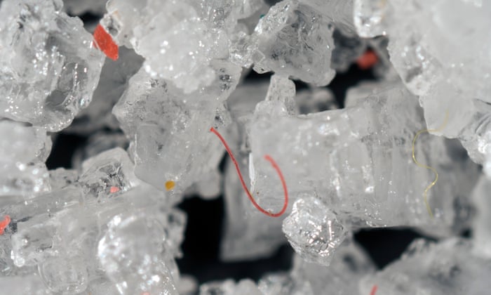| Tiny fragments and filaments of plastic in table salt crystals. Photograph: Paulo Oliveira/Alamy |