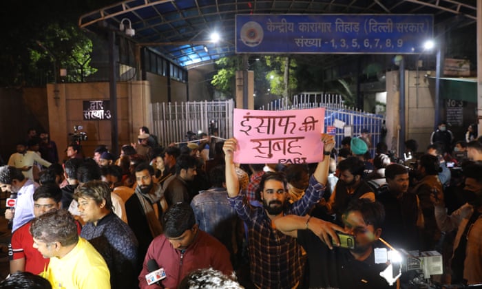 | An Indian man holds a placard reading ‘morning of justice’ outside the prison complex before the hangings in Delhi on Friday. Photograph: Rajat Gupta/EPA |